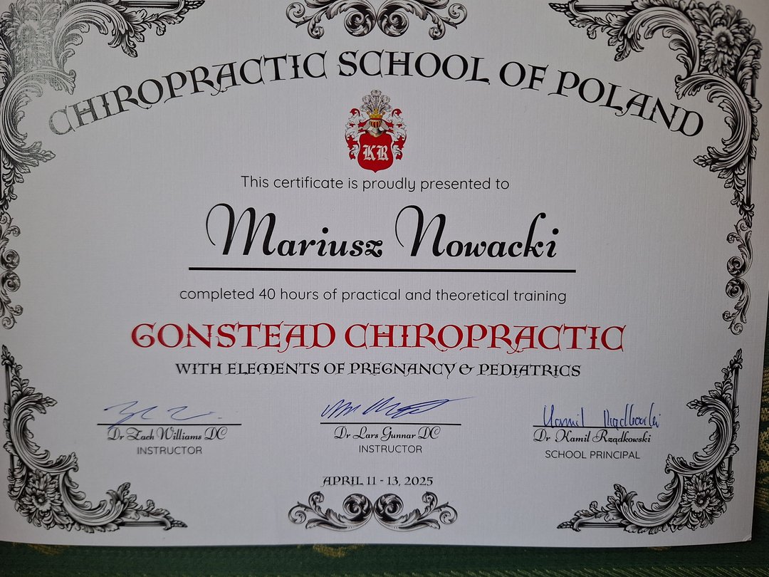 Mariusz Nowacki – Terapeuta manualny, kręgarz, chiropraktyk Od ponad 10 lat pomagam pacjentom w odzyskiwaniu pełnej sprawności i komfortu życia. Specjalizuję się w terapii manualnej oraz chiropraktyce, stosując skuteczne i jednocześnie delikatne techniki lecznicze, które pozwalają na łagodzenie bólu i przywracanie prawidłowej funkcji ciała. Mogę skutecznie pomagać osobom z dolegliwościami takimi jak: - bóle głowy i migreny - bóle pleców i kręgosłupa - bóle szyi i karku - nerwobóle - rwa kulszowa Moja praktyka skupia się na indywidualnym podejściu do każdego pacjenta, zapewniając nie tylko ulgę w bólu, ale także poprawę ogólnej kondycji ciała i jakości życia.